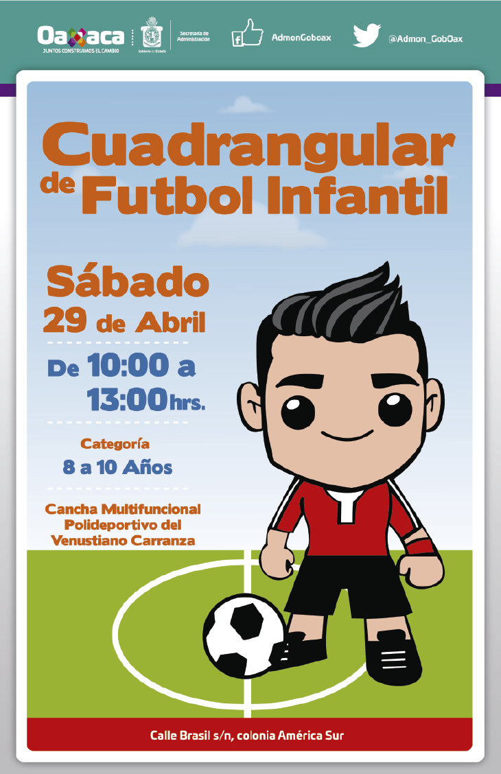 Niños y niñas de 8 a 10 años serán los participantes del Cuadrangular de Fútbol Infantil que se llevará a cabo en la cancha multifuncional del Polideportivo “Venustiano Carranza” el próximo sábado 29 de abril del 10:00 a 13:00 horas.