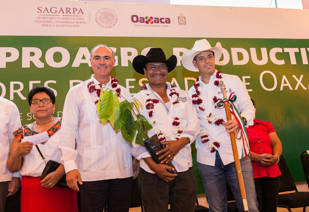 Durante el acto, El Gobernador del Estado y el Secretario Federal hicieron la entrega simbólica a la autoridad municipal de Sola de Vega de una planta de Cacao a productores de la Sierra Sur, así como 10 Cartas de Autorización a beneficiarios del Programa Proagro Productivo.