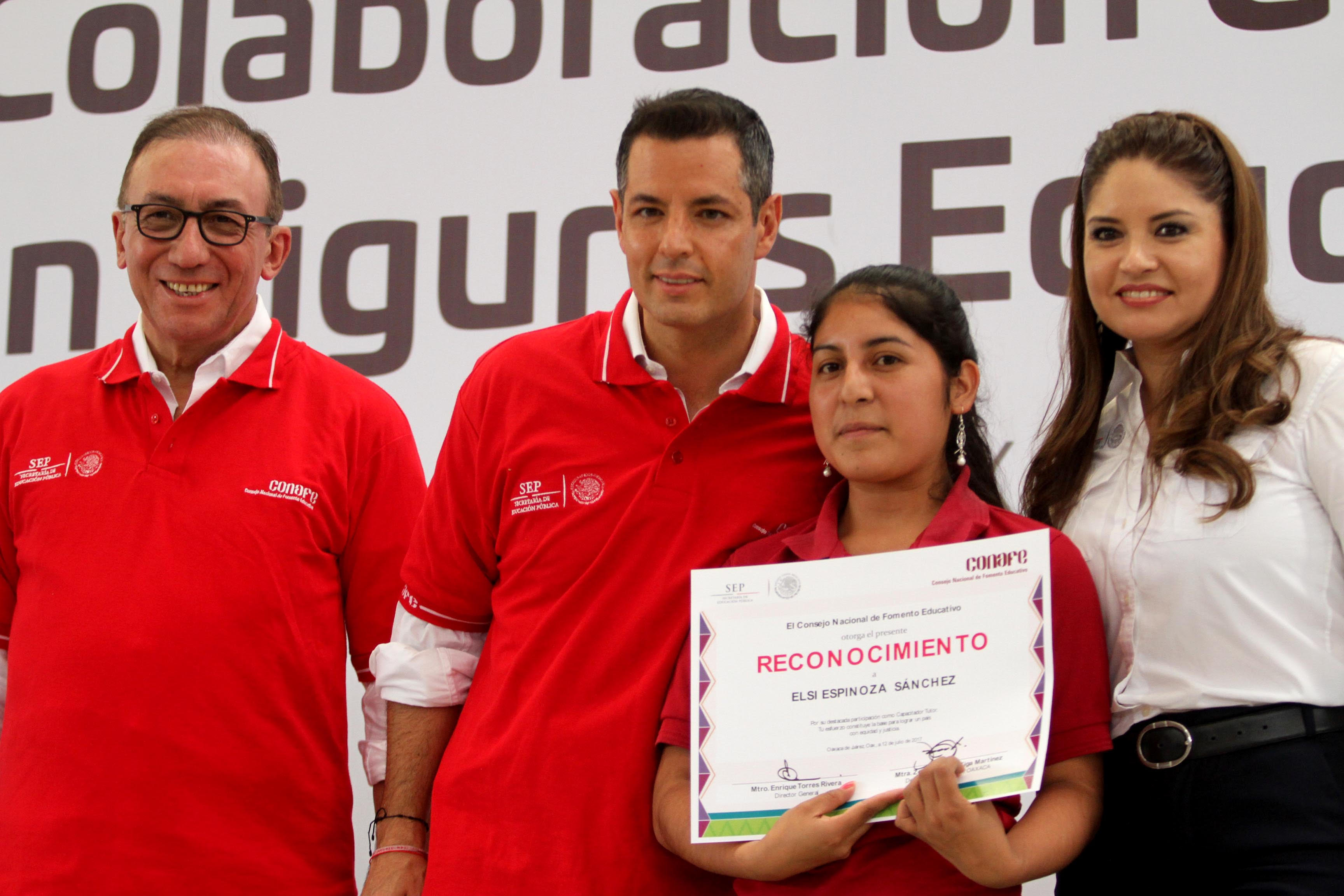 A nombre de los beneficiarios, la asistente educativa de la Secundaria Comunitaria de la Coordinación Regional del Conafe de Santa Cruz Itundujia, Antonia García Bautista, agradeció el apoyo y la oportunidad que se les brinda para que los jóvenes oaxaqueños participen en el quehacer educativo de la entidad.