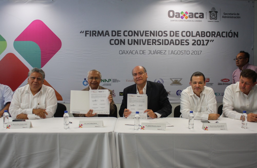 Tlalixtac de Cabrera, Oax. 9 de agosto de 2017. El Secretario de Administración, Javier Villacaña Jiménez, signó convenios de colaboración con 15 instituciones de Educación Superior y especialización, formalizando con ello un trabajo conjunto para mejorar el desarrollo profesional y personal de los trabajadores al servicio del Estado.