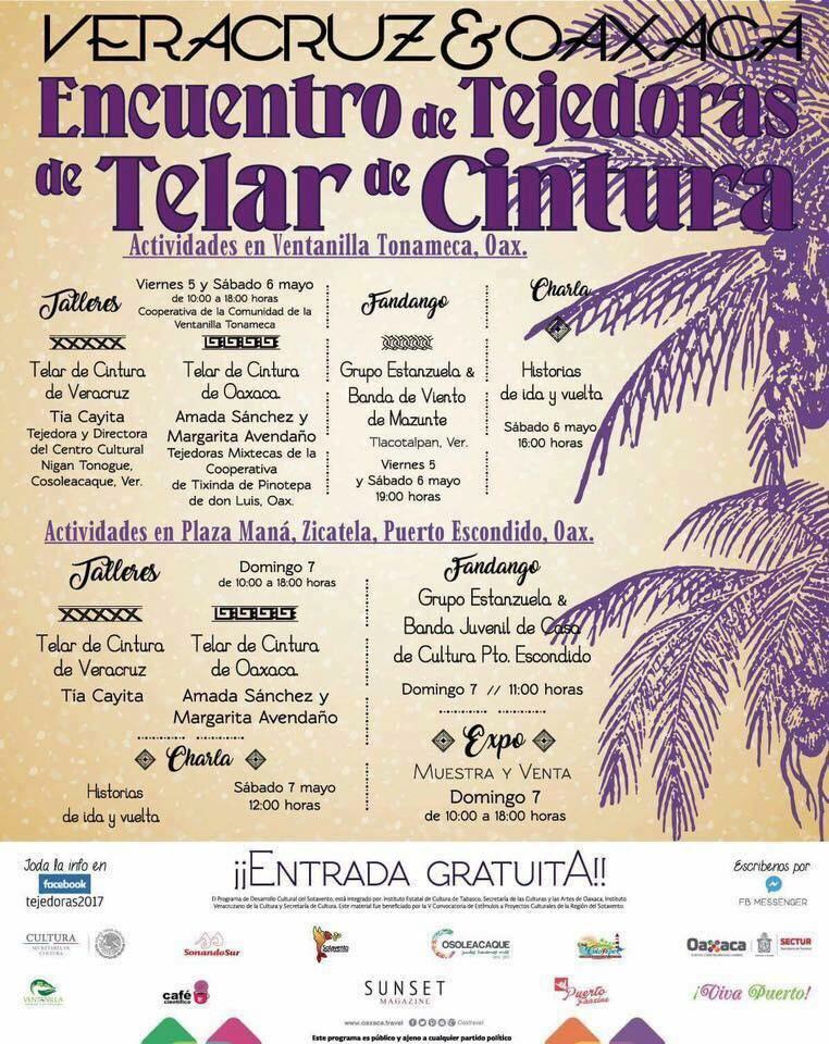 Del 5 al 7 de mayo, la comunidad de Ventanilla, que cuenta con una de las playas más atractivas de la Costa Chica contará con la presencia de las tejedoras quienes serán acompañadas de música representativa de ambos estados interpretada por la Banda de Viento de Mazunte, y el grupo Son Jarocho Estanzuela, de Tlacotalpan, Veracruz.