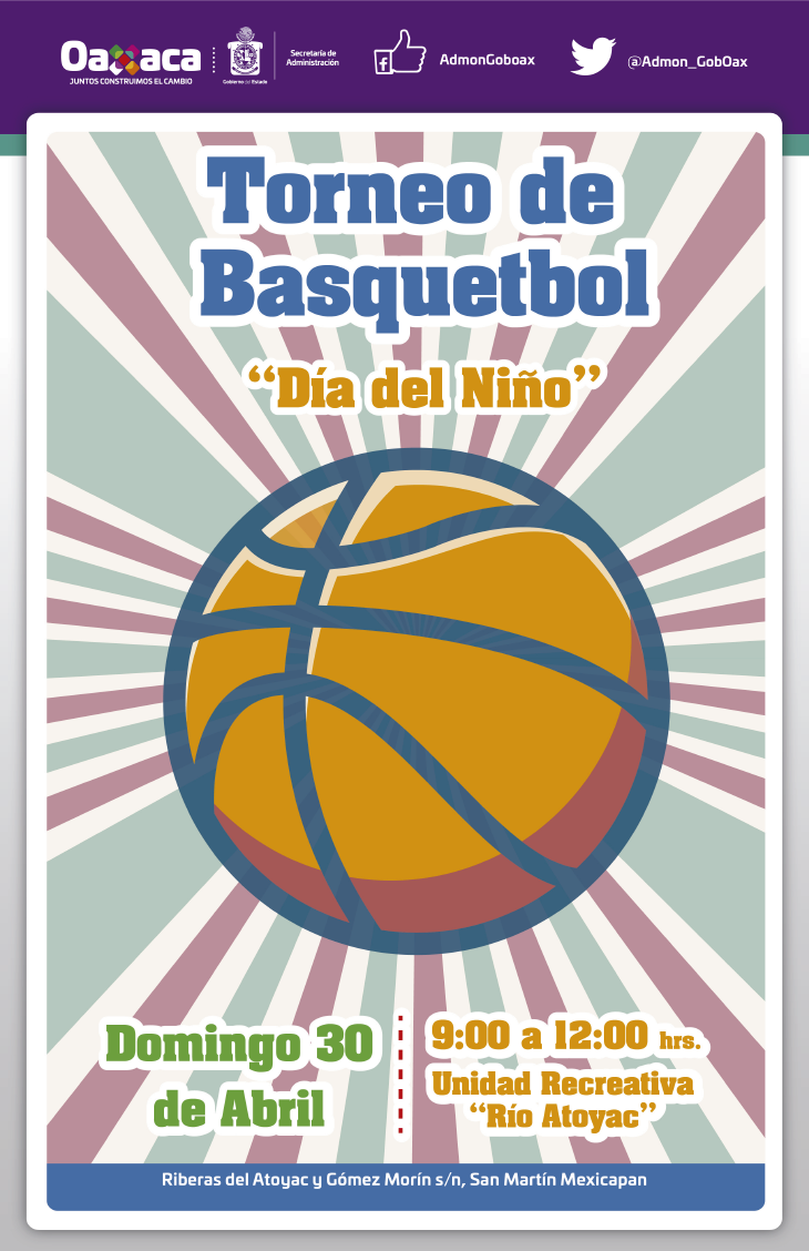 En el marco de la conmemoración del Día del Niño, el Gobierno del Estado, a través de la Secretaría de Administración realizará próximo 30 de abril un Torneo de Básquetbol en la Unidad Recreativa “Río Atoyac”, propiciando la práctica deportiva entre la población infantil.