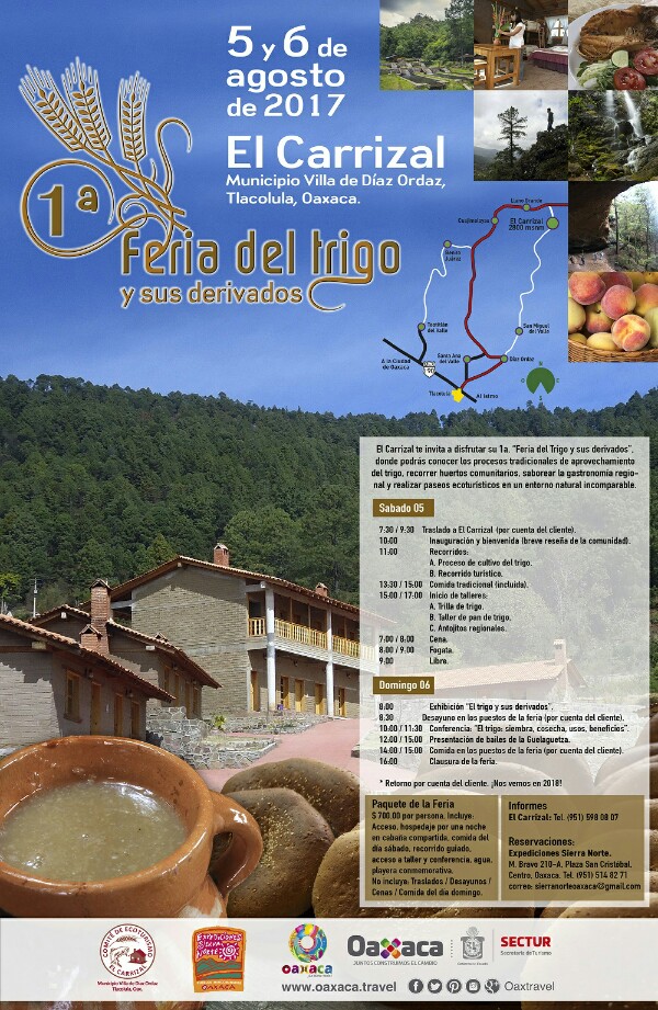 Oaxaca de Juárez, Oax. 2 de agosto de 2017. La Secretaría de Turismo del Estado de Oaxaca (SECTUR), invita a oaxaqueños y turistas a conocer la población El Carrizal, ubicada en el municipio de Villa Díaz Ordaz,  donde se realizará la Primera Feria del Trigo y sus derivados, los días 5 y 6 de agosto.