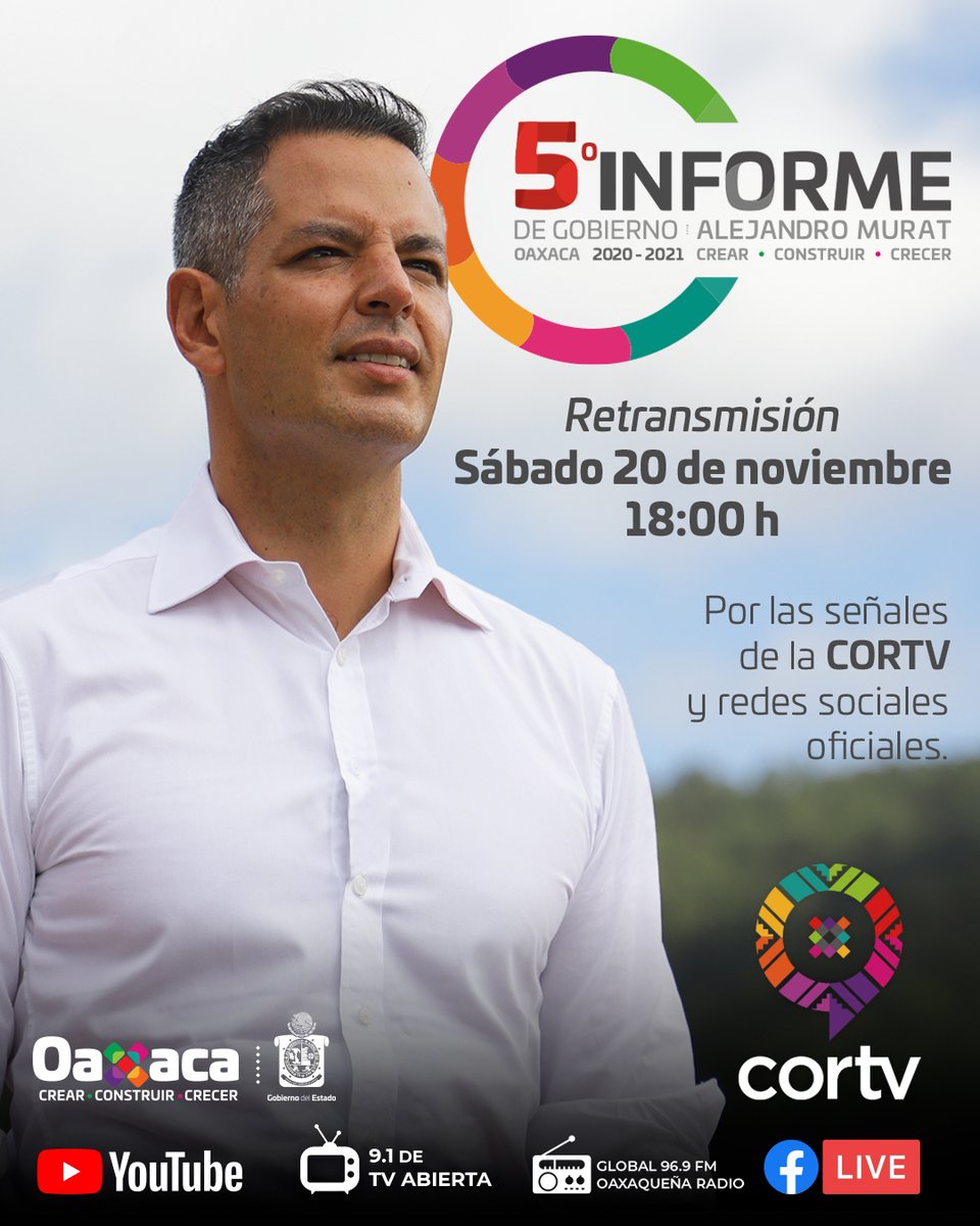 No se pierdan la transmisión del documental del Quinto Informe de Gobierno del maestro @alejandromurat, Gobernador del Estado de #Oaxaca. Sábado 20 de noviembre a las 18:00 horas. A través de las señales de la #CORTV y redes sociales oficiales. #5toInformeOax https://t.co/qJrc32Nkm1