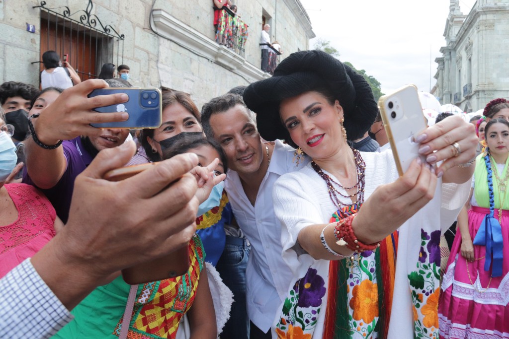 También en compañía de autoridades del municipio de Oaxaca de Juárez, Murat Hinojosa y Morán de Murat contagiaron de alegría a su paso y compartieron su emoción a las personas que se abarrotaron en las calles, desde sus ventanas y terrazas, para apreciar esta muestra de expresión cultural.