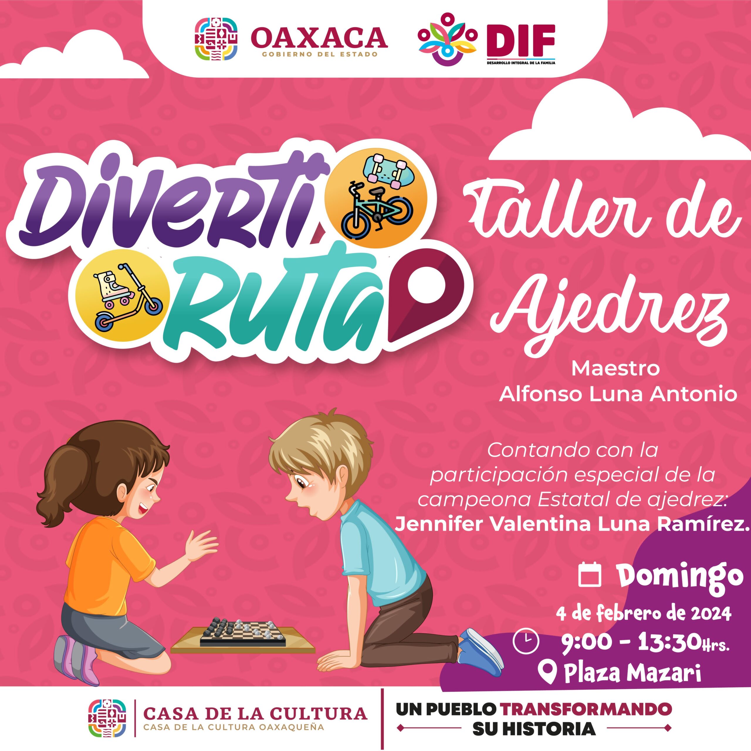 Oaxaca de Juárez, Oax., 2 de febrero de 2024.- El Sistema para el Desarrollo Integral de la Familia (DIF) Oaxaca anuncia que este domingo 4 de febrero espera a las niñas, niños y adolescentes en la trigésima edición de la Diverti Ruta que se realizará de la Fuente de las Ocho Regiones al cruce de las calzadas Porfirio Díaz y Héroes de Chapultepec, en un horario de 9:00 a 13:30 horas.