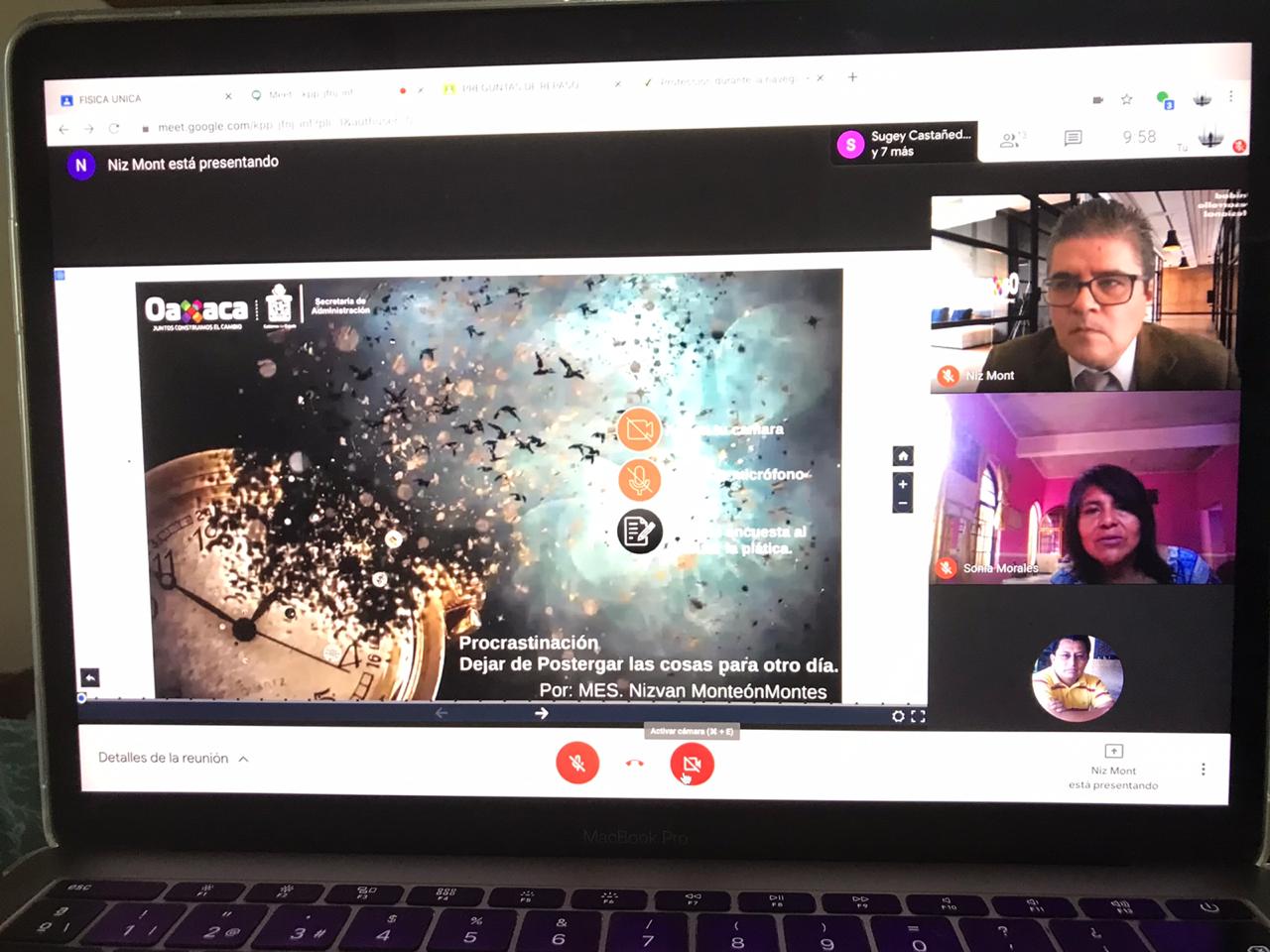 Tlalixtac de Cabrera, Oax., 9 de junio de 2020.-De manera virtual, la Secretaría de Administración brindó a decenas servidoras y servidores públicos la conferencia “Procrastinación, dejar de postergar para otro día”, quienes adquirieron conocimientos y herramientas para realizar de forma eficiente tareas, trabajos y actividades que han sido aplazadas a raíz de la contingencia sanitaria que atraviesa el estado.
