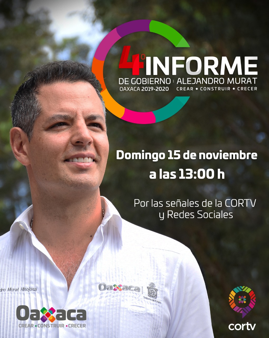 Este domingo 15 de noviembre a las 13:00 horas, el Gobernador @alejandromurat rendirá su #4toInformeOaxaca ante la ciudadanía, a través...