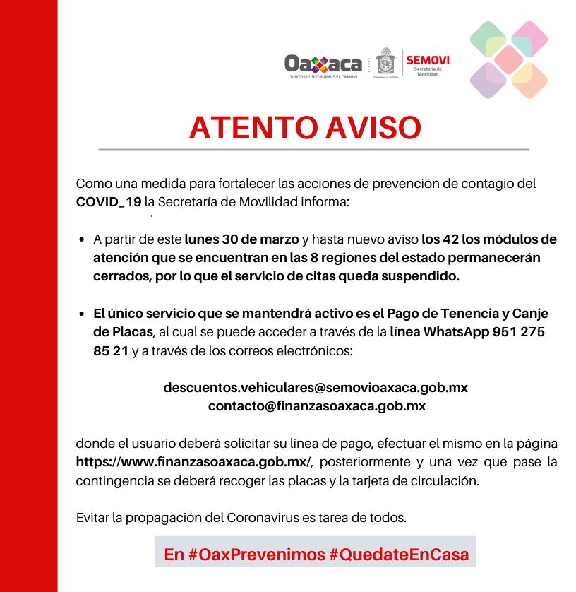 El único servicio que se mantendrá activo es el Pago de Tenencia y Canje de Placas, al cual se puede acceder a través de la línea WhatsApp 951 275 85 21 y a través de los correos electrónicos: descuentos.vehiculares@semovioaxaca.gob.mx y contacto@finanzasoaxaca.gob.mx, donde el usuario deberá solicitar su línea de pago y efectuar el mismo en la página https://www.finanzasoaxaca.gob.mx/.