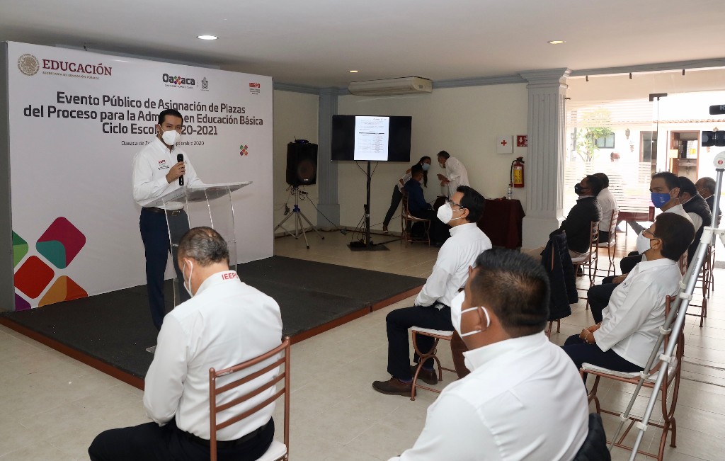 Oaxaca de Juárez, Oax. 20 de septiembre de 2020.- En un hecho inédito y resultado del trabajo conjunto de la administración del gobernador Alejandro Murat Hinojosa, aliado del magisterio, con el Gobierno de México, el Instituto Estatal de Educación Pública de Oaxaca (IEEPO), la delegación federal de la Secretaría de Educación Pública (SEP) y la dirigencia magisterial, realizaron el Acto Protocolario de asignación de centros de trabajo del Proceso para la Admisión en Educación Básica, ciclo escolar 2020-2021.