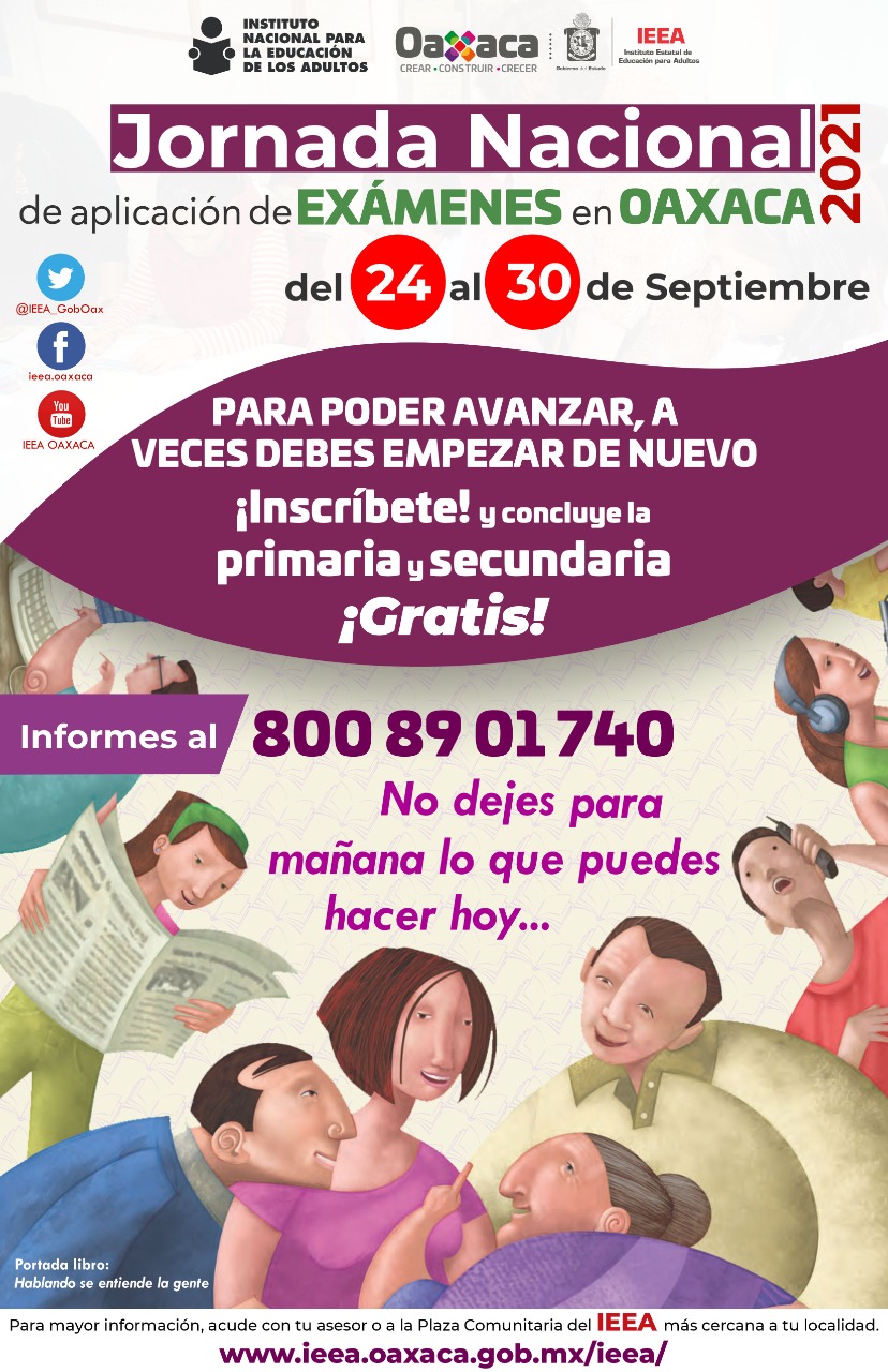 Oaxaca de Juárez, Oax. 20 de septiembre de 2021.- El Instituto Estatal de Educación para Adultos (IEEA) de Oaxaca invita a las personas adultas y jóvenes mayores de 15 años a terminar su primaria o secundaria en la próxima Jornada Nacional de Aplicación de Exámenes a realizarse del viernes 24 al jueves 30 de septiembre en las 26 Coordinaciones de Zona ubicadas en todo el estado.