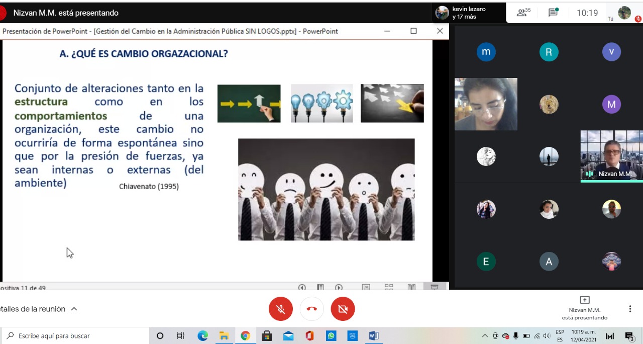 Durante un encuentro virtual, el capacitador Nizvan Monteón Montes, de la Unidad de Desarrollo Profesional, orientó a las y los participantes a optimizar su desempeño de funciones, empleando nuevas acciones o diligencias inclinadas hacia el logro de objetivos y metas institucionales.