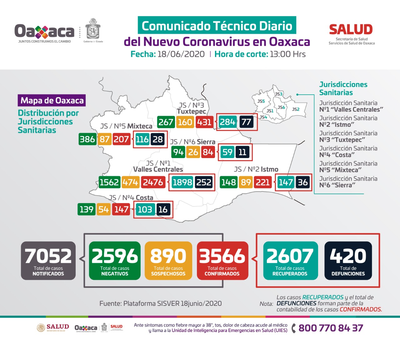 Oaxaca de Juárez, Oax. 18 de junio de 2020.- Los Servicios de Salud de Oaxaca (SSO) este jueves 18 de junio, notificaron 116 contagios nuevos de COVID-19, para acumular tres mil 566 confirmados en todo el estado, de los cuales únicamente se mantienen 539 casos activos.