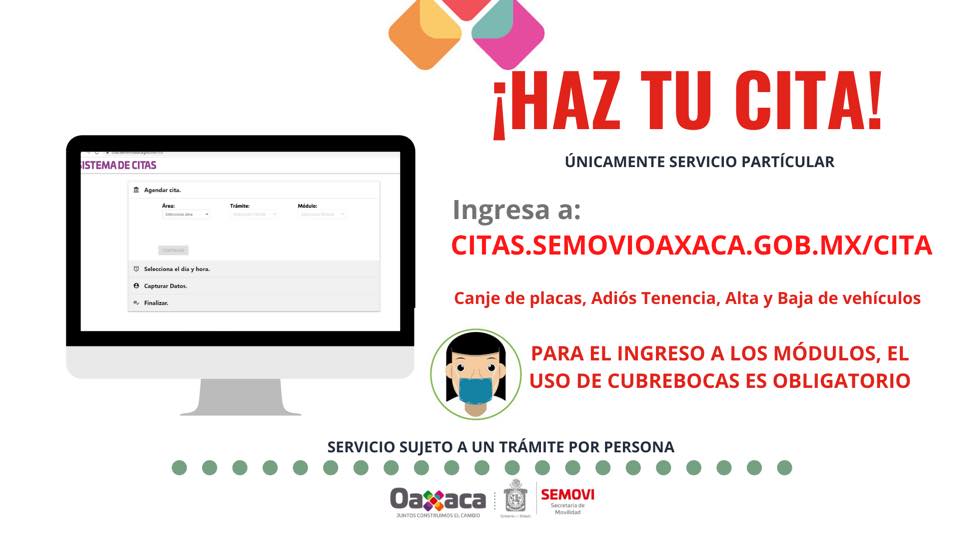 Para acceder a estos servicios las y los interesados deberán tramitar su cita en la página https://citas.semovioaxaca.gob.mx/cita, donde podrán elegir el día y la hora en la que quieran acudir al módulo de atención.