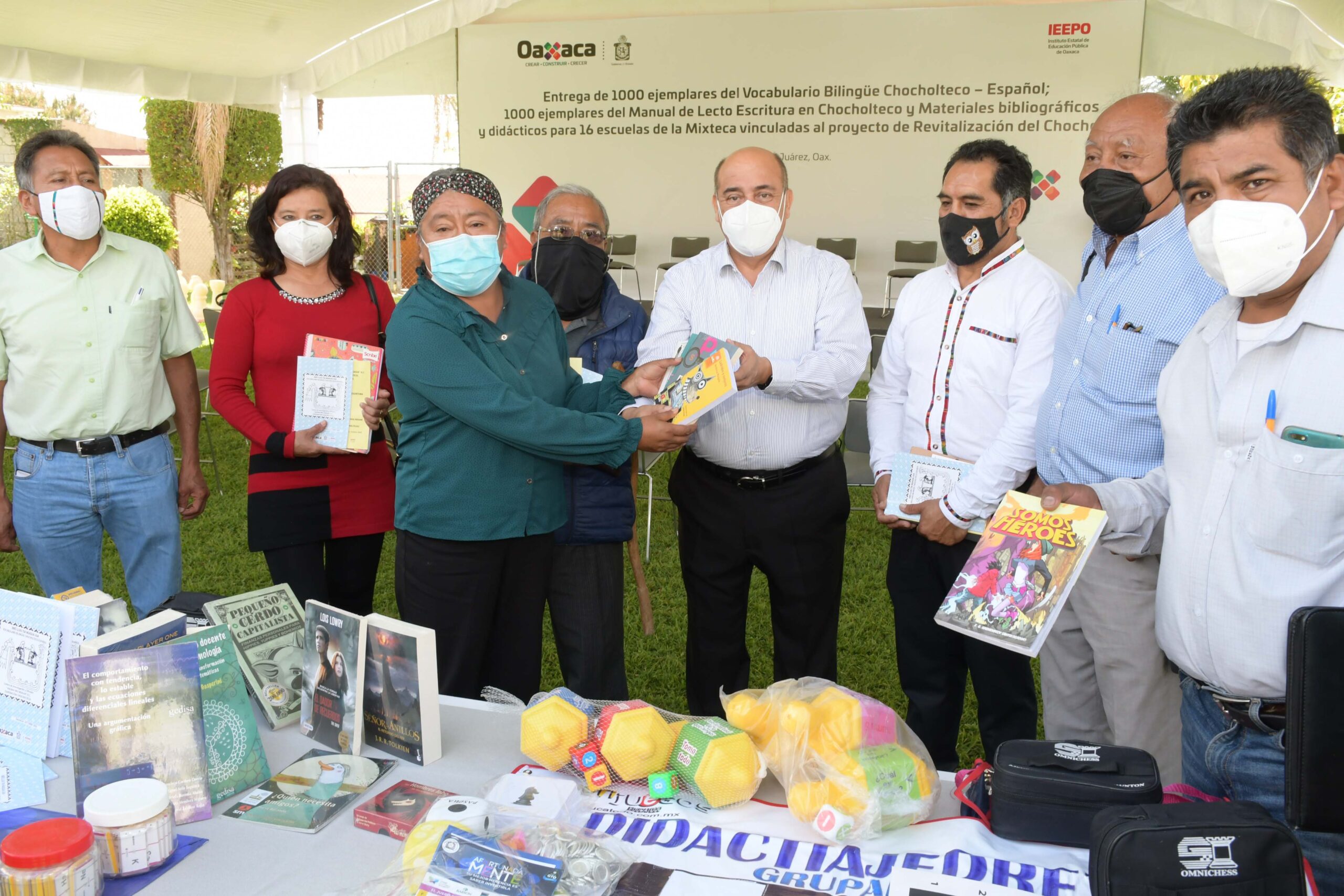 Oaxaca de Juárez, Oax. 7 de noviembre de 2021.- Contribuyendo a la preservación y rescate de las lenguas indígenas de la entidad, el director general del Instituto Estatal de Educación Pública de Oaxaca (IEEPO), Francisco Ángel Villarreal, entregó mil ejemplares del Vocabulario Bilingüe Chocholteco–Español y mil del Manual de Lecto Escritura en Chocholteco, ambos elaborados por docentes y hablantes de la zona, así como materiales bibliográficos y didácticos para 16 escuelas de educación básica de la Mixteca.