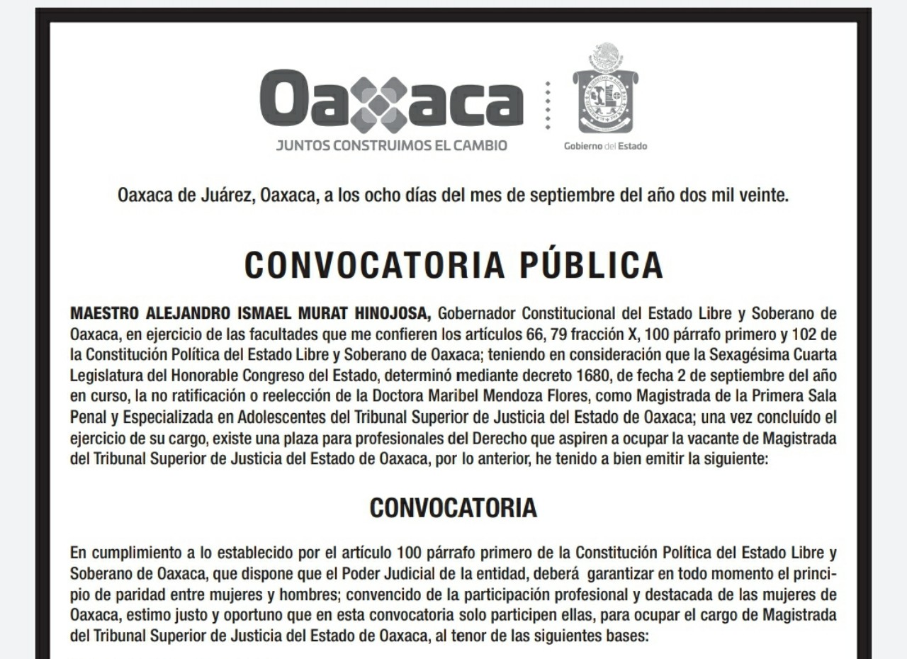Dicha convocatoria establece que en cumplimiento al artículo 100, párrafo primero de la Constitución Política de Oaxaca, el Poder Judicial de la entidad deberá garantizar en todo momento el principio de paridad entre mujeres y hombres; en acierto a la participación profesional y destacada de las mujeres de Oaxaca, y en la que se estima que solo participen ellas para ocupar dicho cargo.