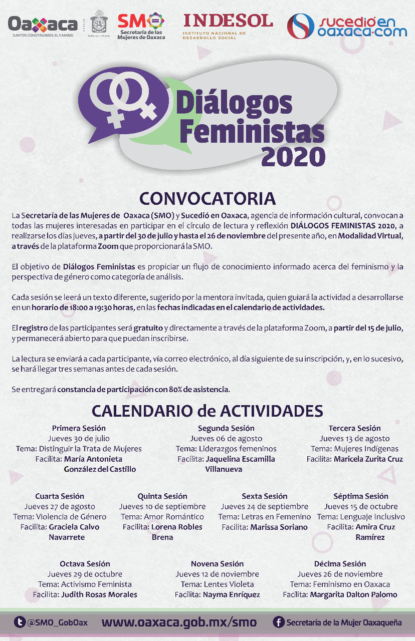 Oaxaca de Juárez. Oax. 28 de julio de 2020.- Con el objetivo de propiciar un flujo de conocimiento informado acerca del feminismo y la perspectiva de género como categoría de análisis, la Secretaría de las Mujeres de Oaxaca (SMO) y la agencia de información cultural “Sucedió en Oaxaca”, invitan a participar en el círculo de lectura y reflexión “Diálogos feministas 2020”.