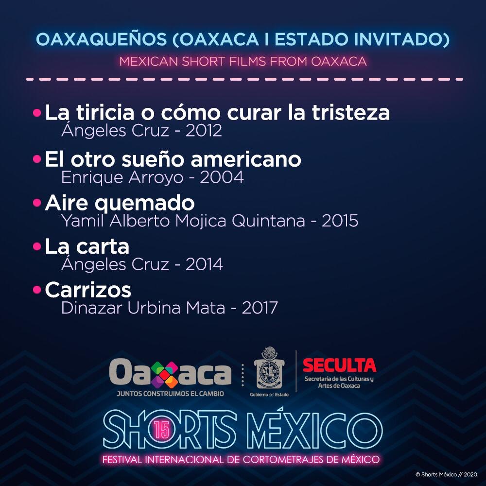 El Festival Shorts México en este año contará con la participación de cinco cineastas oaxaqueños que son Ángeles Cruz  con “La tiricia o como curar la tristeza” y “La Carta”; Enrique Arroyo con “El otro sueño americano”; Yamil Alberto Mojica Quintana con “Aire Quemado” y Dinazar Urbina Mata con “Carrizos”.