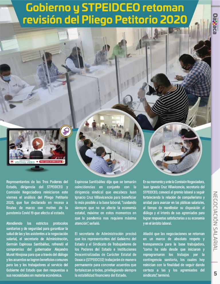 Oaxaca de Juárez, Oax., 26 de agosto de 2020.- Representantes de los Tres Poderes de Estado, dirigencia del STPEIDCEO y la Comisión Negociadora reiniciaron el análisis del Pliego Petitorio 2020, que fue declarado en receso a finales de marzo por la pandemia COVID 19 que afecta al estado. Los detalles de esta nota, videos y fotografías se encuentran en las páginas de la revista digital Construyendo Oaxaca, elaborada por la Secretaría de Administración que encabeza Germán Espinosa Santibáñez, disponible para toda la población los lunes de cada semana.