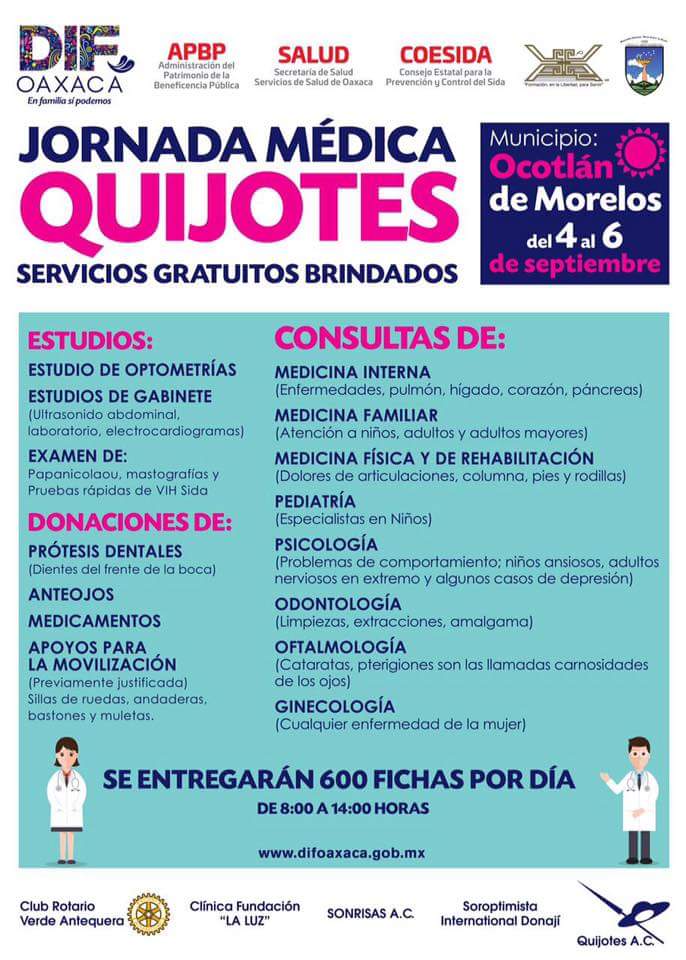 Dif Oaxaca te invita a la Jornada Médica Quijotes en Ocotlán de Morelos del 4 al 6 de Septiembre