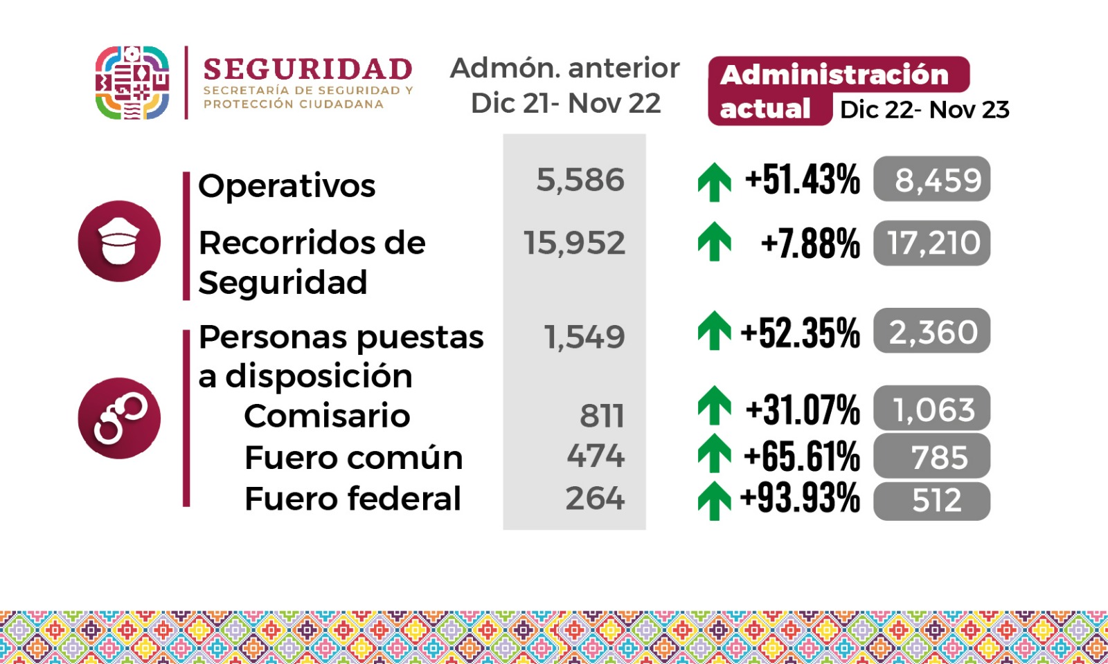Lo anterior, como producto de los 8 mil 459 recorridos de seguridad y vigilancia efectuados de diciembre de 2022 a noviembre de 2023, que representan 51 por ciento más que en el periodo anterior. De esta manera, se contabiliza también 7 por ciento más en recorridos de seguridad y vigilancia con 17 mil 210 efectuados.