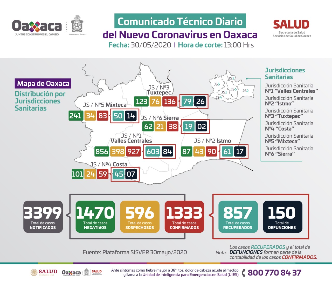 Respecto a las defunciones, lamentó que se tenga el registro de 150 decesos, siete más que ayer; éstas últimas registradas en Oaxaca de Juárez con tres, San Juan Bautista Tuxtepec con dos, en Miahuatlán de Porfirio Díaz se registró un deceso, lo mismo que en Santa María del Tule.