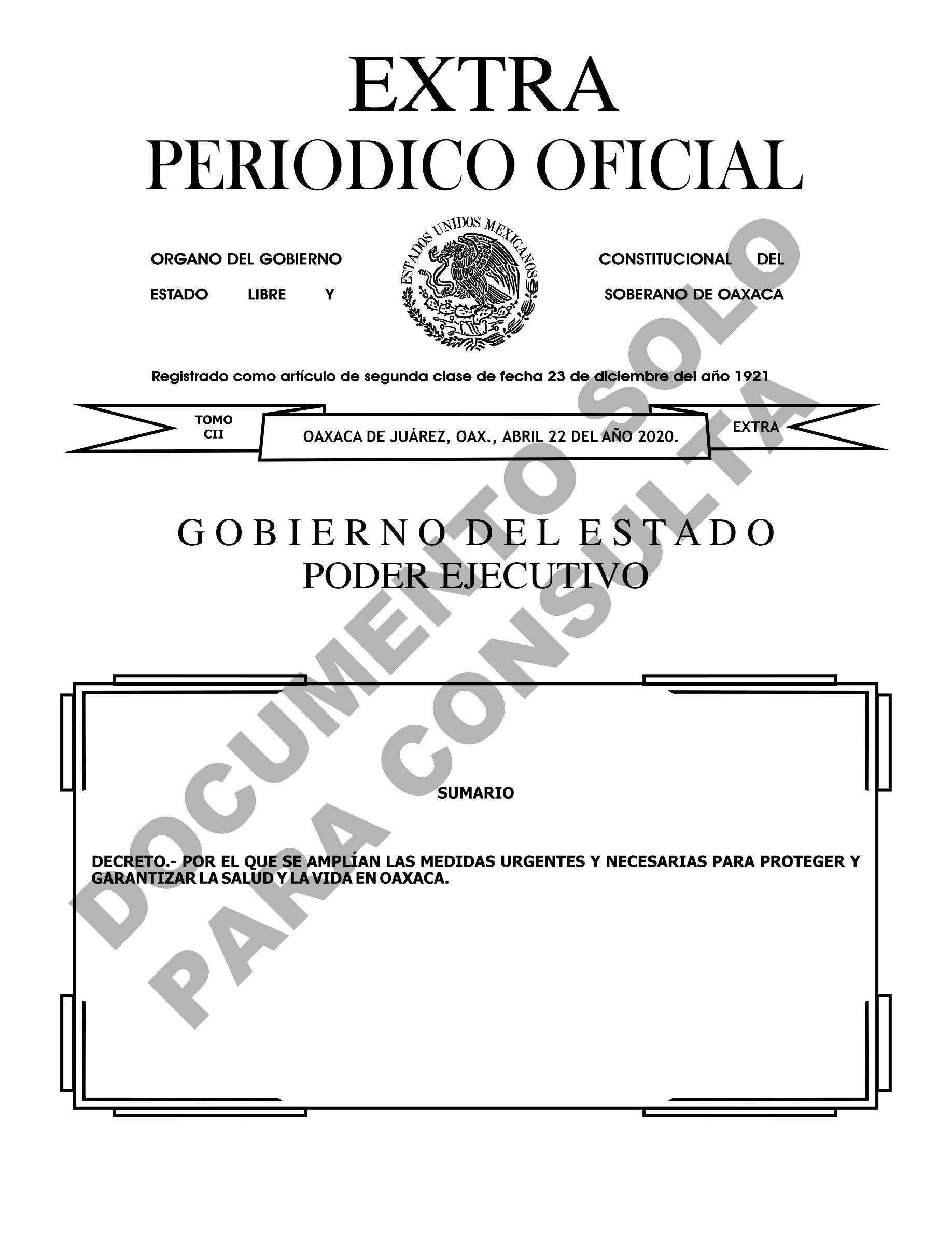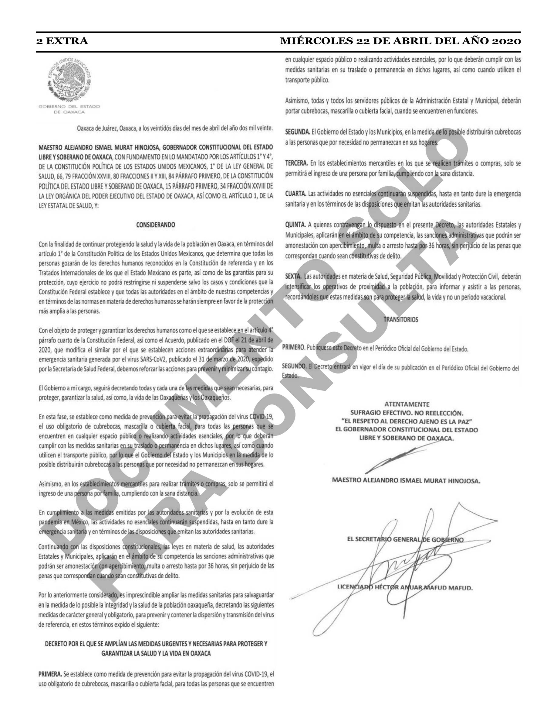 Oaxaca de Juárez, Oax. 22 de abril de 2020. El gobernador Alejandro Murat Hinojosa emitió este miércoles un tercer decreto con el cual se amplían las medidas urgentes y necesarias para proteger y garantizar la salud y la vida de las y los oaxaqueños, ante la pandemia del COVID-19.