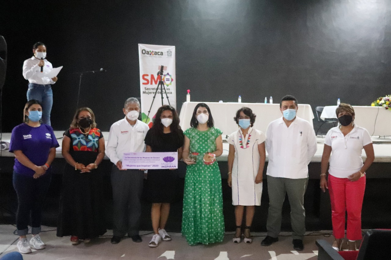 Ante la subsecretaria de Promoción, Participación y Equidad de la SMO, Angélica Avilés Álvarez y el director de BanOaxaca, Igmar Matus, Rogelia González reconoció en Ana Vásquez a una aliada, que junto con el Gobernador, trabajan para atender los principales requerimientos de las mujeres que salen huyendo de sus casas por la violencia familiar.