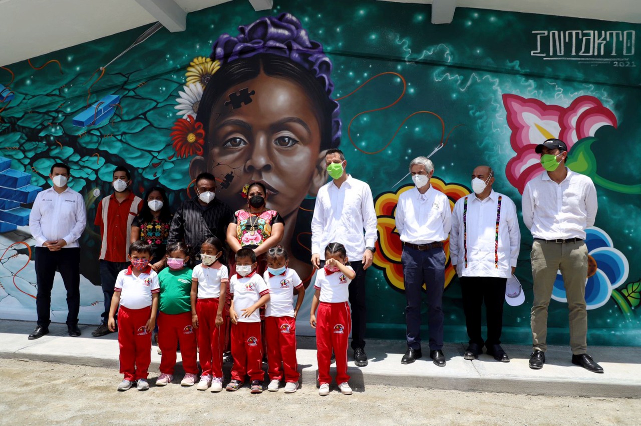 Asimismo, en alianza con la organización Concentrarte y como parte de los alcances del programa, la última semana de agosto se llevaron a cabo talleres con las y los alumnos, maestros y padres de familia del Centro de Educación Inicial Indígena que culminaron con la creación del mural “Bordando esperanza”, diseñado por el artista Iván Intakto, que refleja la fuerza e identidad de los pueblos del Istmo, así como su perseverancia y resistencia para afrontar los retos que dejaron los terremotos de 2017 en esta región.