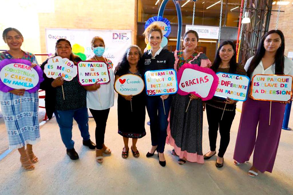 “Hoy estamos cumpliendo con nuestra palabra empeñada y con una de nuestras metas trazadas: entregar parques incluyentes maravillosos, que crean tejido social, unidad y comunidad en beneficio de nuestra niñez oaxaqueña. Como nos lo planteamos al principio de la administración de mi esposo, trabajamos de la mano con autoridades municipales para el rescate de espacios públicos que nos permitieran cambiar el rostro de sus comunidades, dándoles un nuevo rostro y con un solo objetivo: ver sonreír a nuestras niñas y niños”, asentó, la esposa del gobernador.