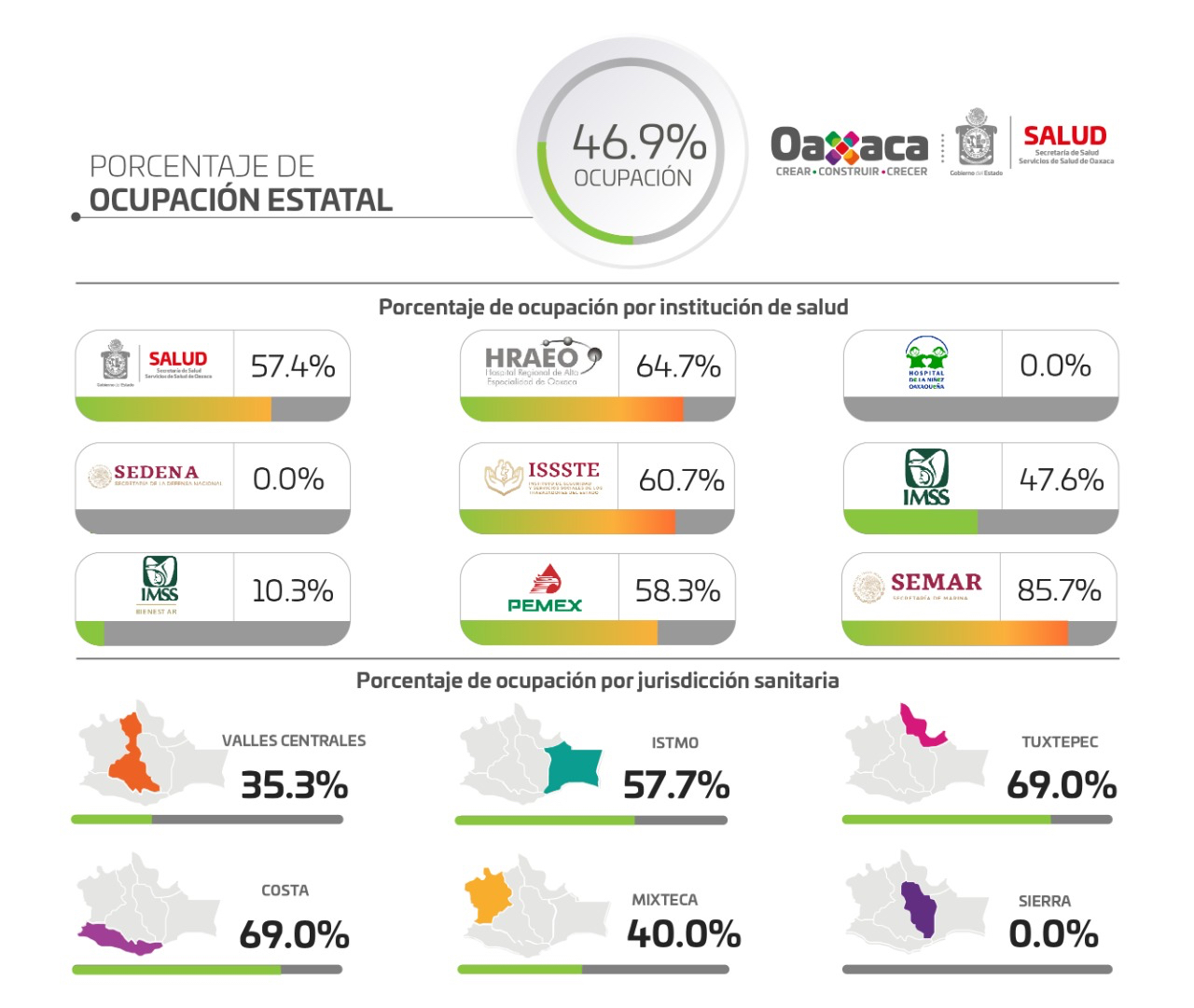 Por Jurisdicción Sanitaria, Valles Centrales registra un 35.3 por ciento, Istmo 57.7 por ciento, Tuxtepec y Costa 69 por ciento cada uno, Mixteca 40 por ciento y la Sierra 0 por ciento.