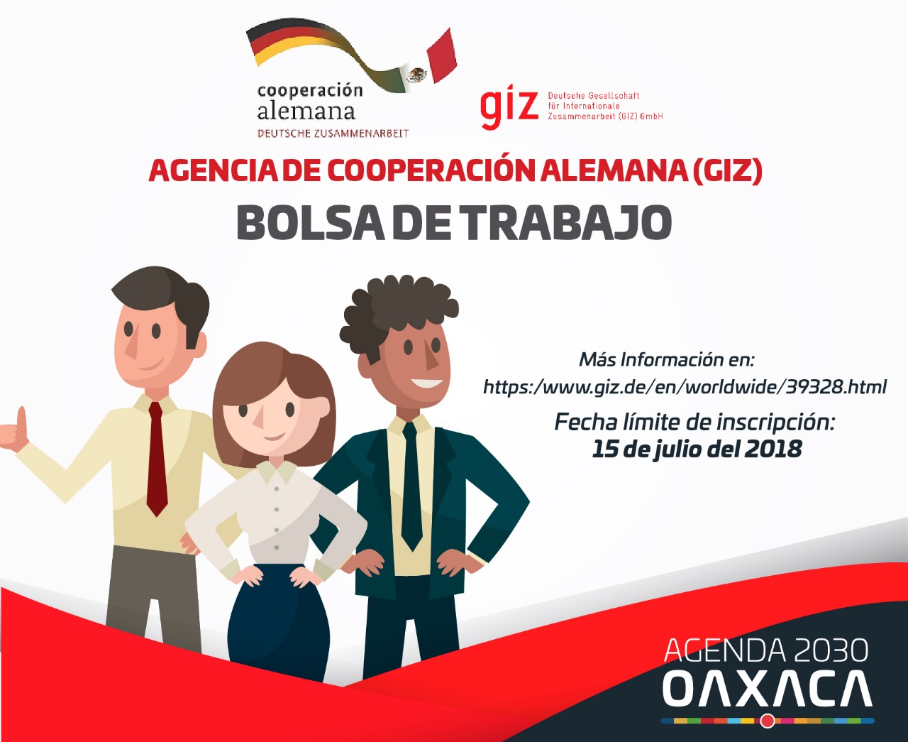 Oaxaca de Juárez, Oax. 10 de julio de 2018. La Agencia de Cooperación Alemana (GIZ, por sus siglas en inglés) en México, emitió una convocatoria abierta para todos los profesionistas interesados en concursar para el puesto de Asesor(a) Técnico(a) en el proyecto: «Acompañamiento del proceso de implementación de la Agenda 2030 en Oaxaca».
