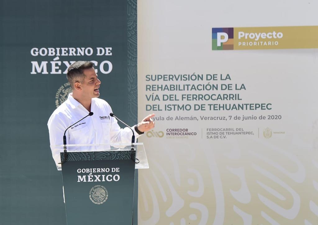 Sayula de Alemán, Veracruz, 7 de junio de 2020. “Este proyecto será considerado como la llave que le abrió la oportunidad de prosperidad y bienestar al Sureste de México”, expresó el gobernador Alejandro Murat Hinojosa al participar en el banderazo de inicio de la modernización del ferrocarril interoceánico del Istmo de Tehuantepec, que este domingo puso en marcha el presidente Andrés Manuel López Obrador.