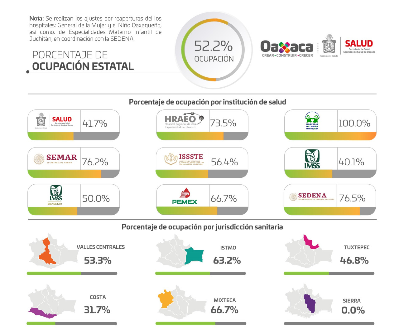 Por ello, el día de hoy la red hospitalaria para COVID-19 en Oaxaca, se encuentra de manera general al 52.2% de ocupación, ya que durante la última jornada se reportaron ocho nuevos ingresos, para un total de 261 personas que se encuentran recibiendo atención especializada.