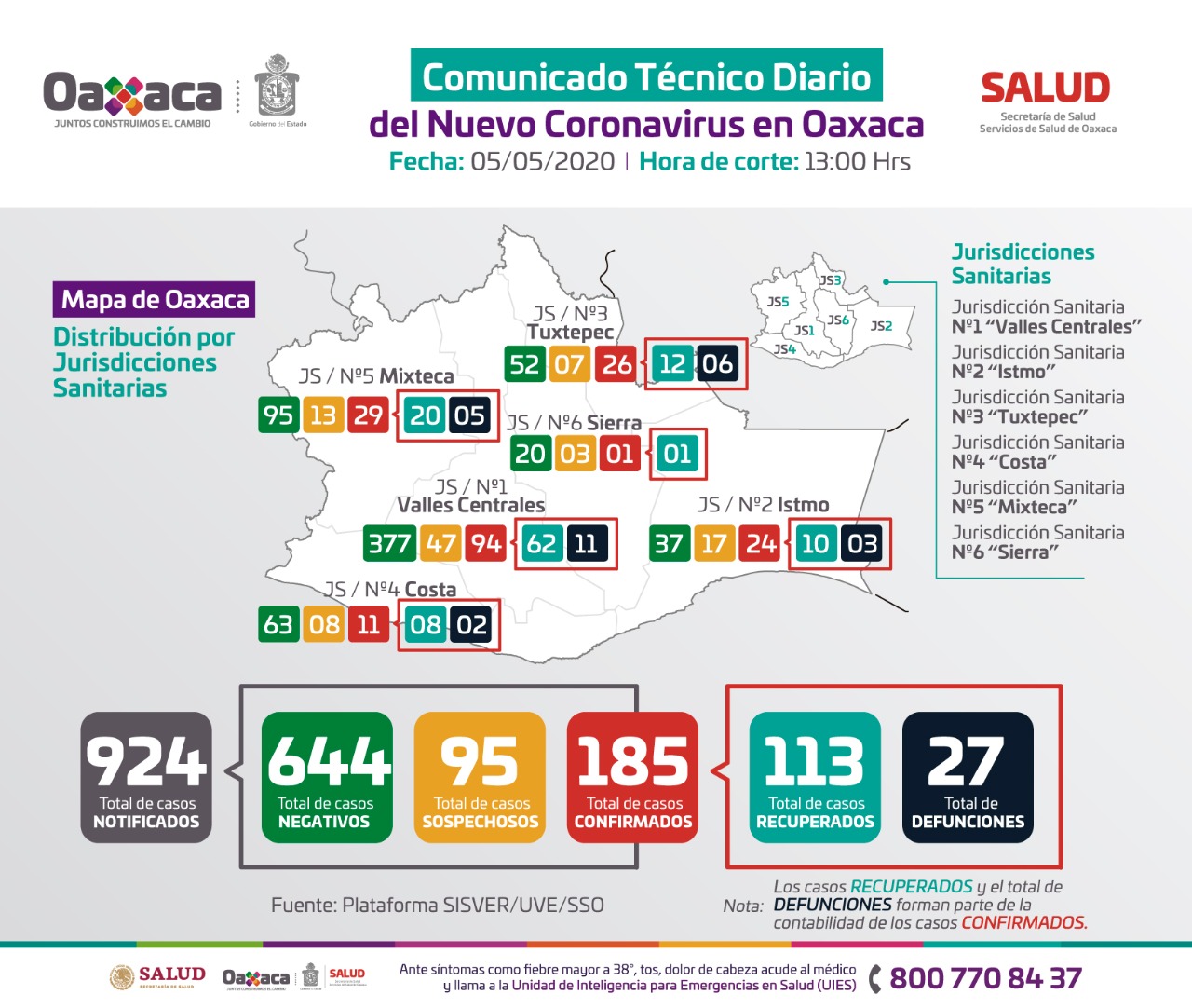 Oaxaca de Juárez, Oax. 5 de mayo de 2020.- De acuerdo con los resultados obtenidos por laboratorio, avalados por la Secretaría de Salud Federal, Oaxaca reporta 13 nuevos casos positivos a COVID-19, con lo que mantiene un acumulado de 185 pacientes, de los cuales a la fecha se encuentran activos 45.