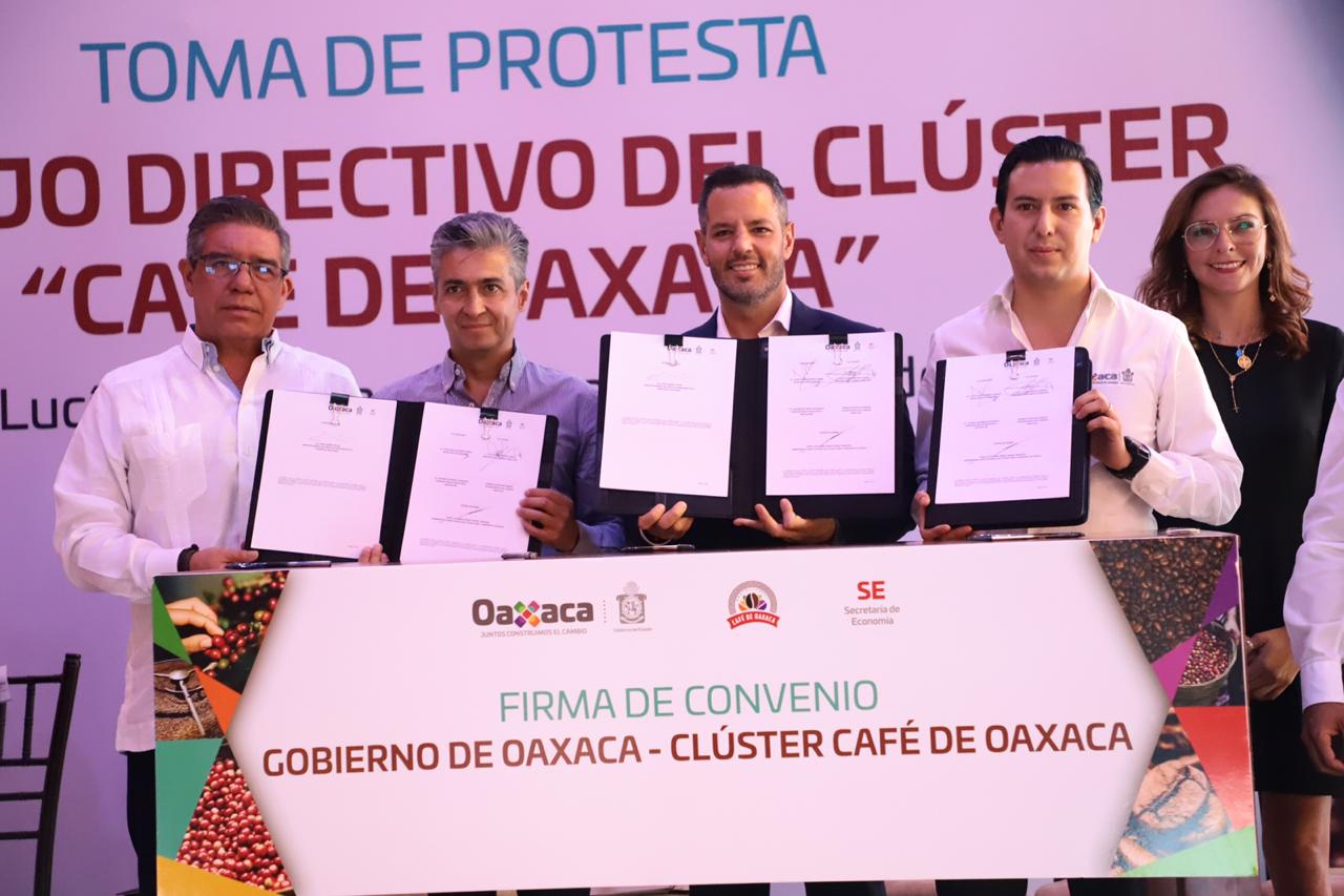 En el marco de esta actividad, el Gobernador y el titular del IMPI firmaron como testigos de honor dos convenios de colaboración, el primero de ellos entre el Clúster Café de Oaxaca y la Secretaría de Economía del Estado y el segundo, entre este mismo Clúster y BanOaxaca. El primer acuerdo permitirá desarrollar estrategias de vinculación y coordinación de esquemas de trabajo para este Clúster,  orientando el mejoramiento de la productividad, competitividad, modernización, tecnología y desarrollo económico.