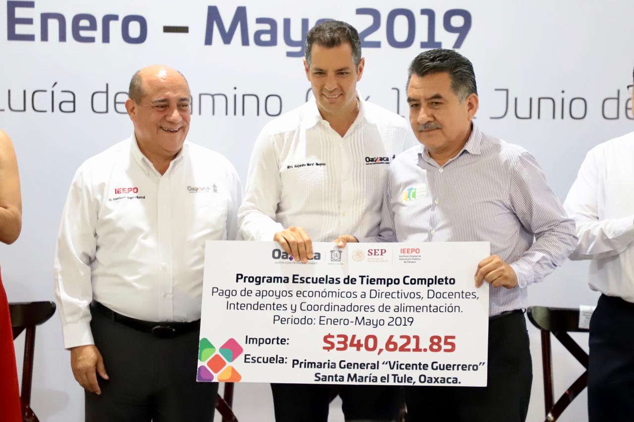 Santa Lucía del Camino, Oax. 17 de junio de 2019. Para el fortalecimiento de la educación, el gobernador Alejandro Murat Hinojosa inició la entrega de apoyos económicos por un monto total de 364.8 millones de pesos correspondiente al Ejercicio Fiscal 2019 del Programa de Escuelas de Tiempo Completo (PETC). Con ello se beneficiará a 5 mil 349 directivos, docentes, intendentes y coordinadores de alimentación.
