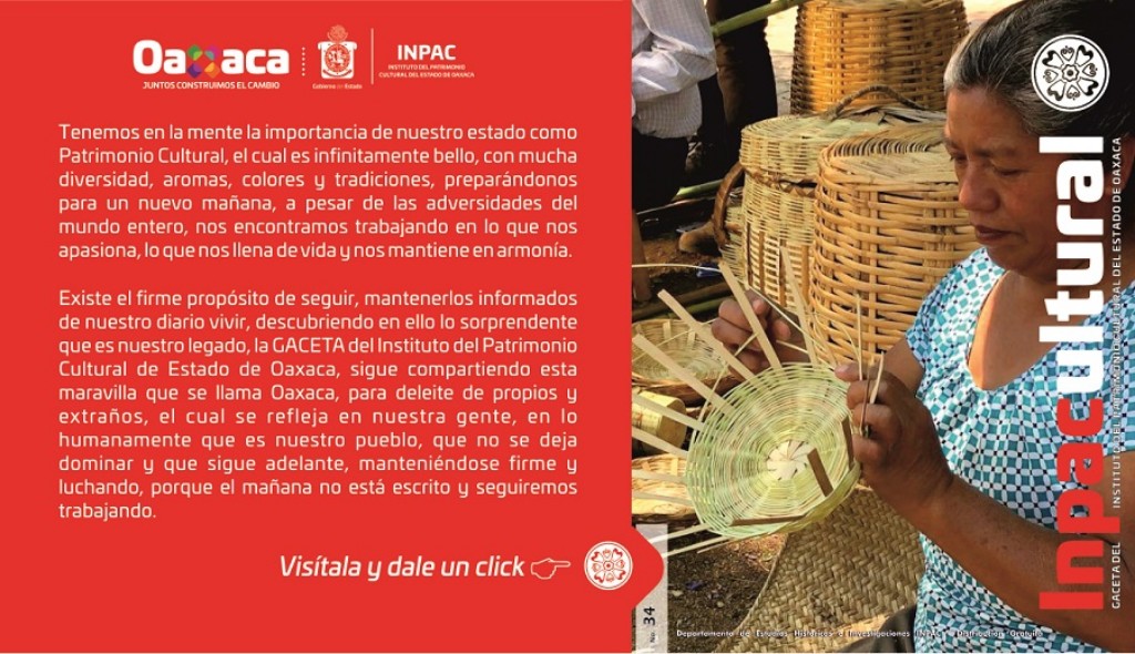 Oaxaca de Juárez, Oax. 22 de julio de 2020- El Instituto del Patrimonio Cultural del Estado de Oaxaca (Inpac) pone a disposición de la ciudadanía en general la edición 34 de la gaceta “Inpac Cultural”, la cual dedica diversos artículos al patrimonio cultural y humano de Oaxaca.