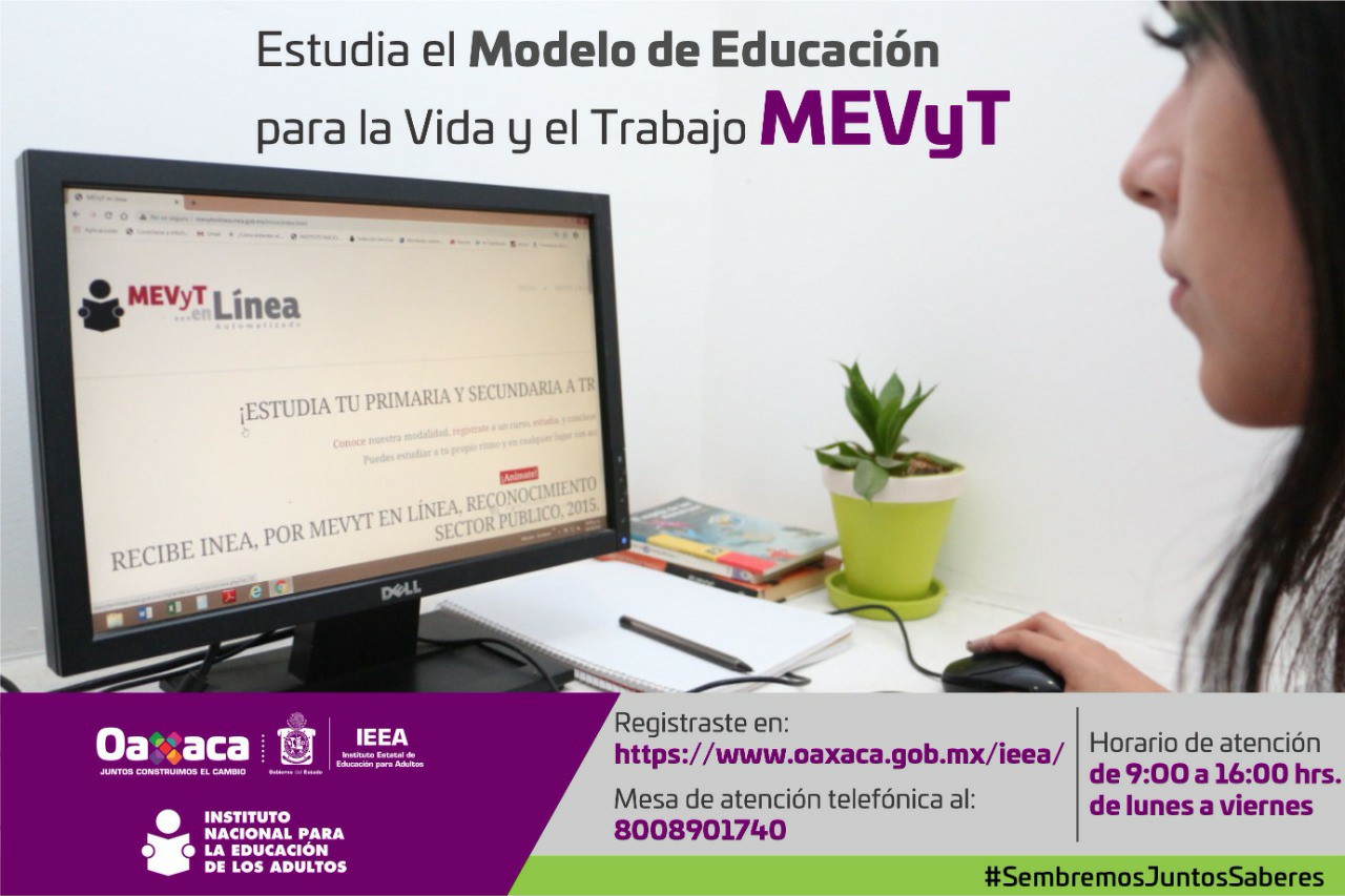 El MEVyT en línea y virtual son las modalidades electrónicas que permiten al educando oaxaqueño continuar sus estudios de educación primaria o secundaria desde una computadora o dispositivo móvil con internet, o una computadora sin conexión pero con programas específicos; el IEEA invita a conocer esta opción educativa en: http://mevytenlinea.inea.gob.mx/.