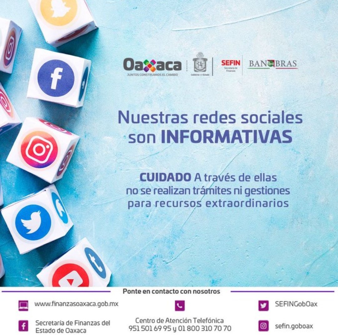 Es indispensable precisar que las cuentas en redes sociales de la Sefin son de carácter estrictamente informativo, por lo que ningún servidor público está autorizado para realizar a través de ellas trámites ni gestiones, por lo que se hace un llamado a la población en general a no dejarse sorprender por personas malintencionadas, y evitar ser víctimas de la comisión de fraude o actos de corrupción en agravio suyo o de sus comunidades.
