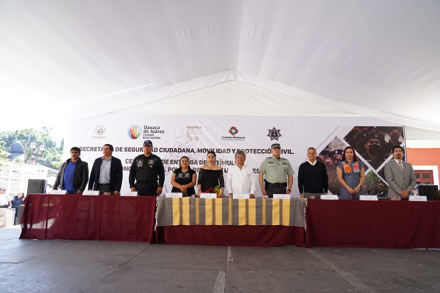 Acompañado del titular de la Defensoría de los Derechos Humanos del Pueblo de Oaxaca, José Bernardo Rodríguez Alamilla, el coordinador estatal de la Guardia Nacional, Jorge Adán Torres Márquez, en representación del General Brigadier Diplomado de Estado Mayor, Benedicto Santa María González, el secretario de Seguridad Ciudadana, Movilidad y Protección Civil, Raúl Ávila Ibarra, así como concejalas y concejales y funcionarios municipales, el edil capitalino hizo entrega de estímulos económicos a los elementos de la corporación que brindan seguridad a la ciudadanía del municipio de Oaxaca de Juárez.