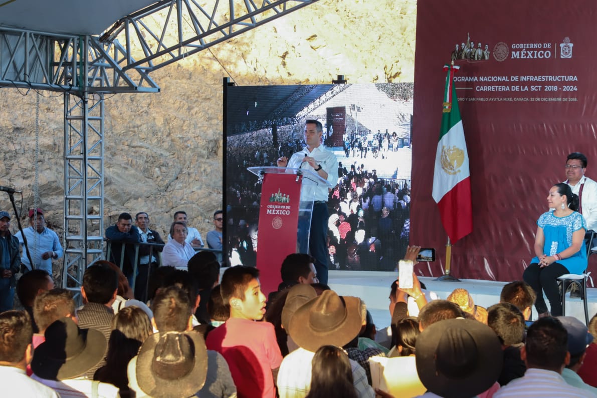 San Pedro y San Pablo Ayutla, Mixe, Oax. 22 de diciembre de 2018. «Hoy, en unidad, mi gobierno caminará al mismo paso y con la misma fuerza que usted representa para transformar a Oaxaca» afirmó el gobernador Alejandro Murat Hinojosa durante la presentación del Programa Nacional de Infraestructura Carretera que realizó el Presidente de México, Andrés Manuel López Obrador en esta localidad.