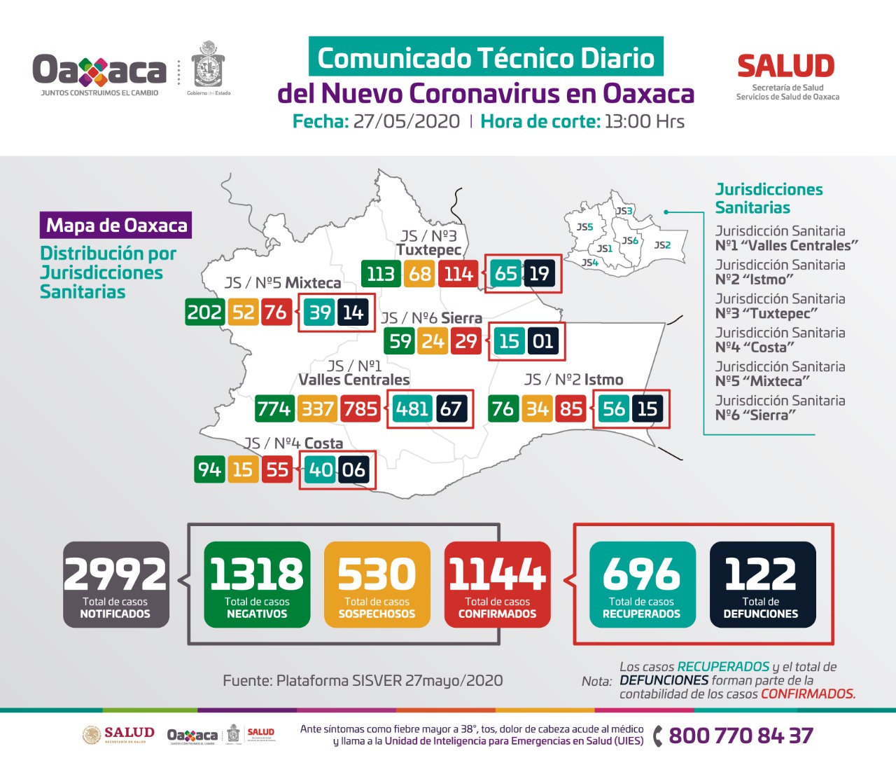 Especificó que la Jurisdicción Sanitaria de Valles Centrales ha notificado 785 positivos y 67 fallecimientos; Tuxtepec 114 pacientes y 19 víctimas fatales; Istmo de Tehuantepec concentra 85 confirmados y 15 muertes.