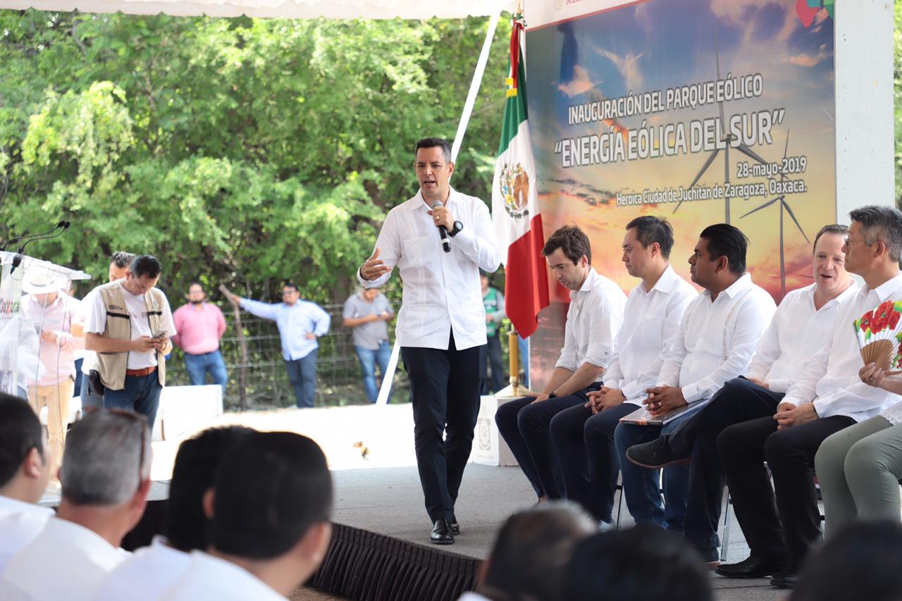 En compañía de la secretaria de Energía del Gobierno de México, Norma Rocío Nahle García; así como del presidente y director general de Mitsubishi México, Masahiko Kono, el Jefe del Poder Ejecutivo realizó el corte del listón inaugural de este proyecto avalado por consulta a los pueblos indígenas, que se suma a la competitividad y al desarrollo sustentable del estado con la instalación de 132 aerogeneradores sobre una superficie de cuatro mil 500 hectáreas.