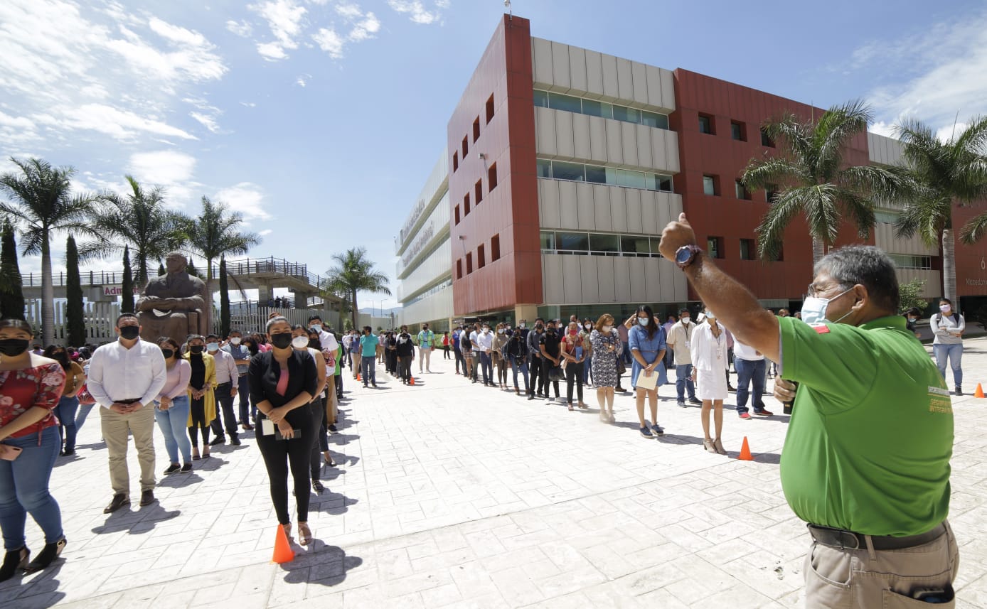 Tlalixtac de Cabrera, Oax., 21 de junio de 2021.- Los complejos de Ciudad Administrativa, Ciudad Judicial, Palacio de Gobierno, el Archivo General del Estado de Oaxaca (AGEO) y la Oficina de Pensiones tuvieron una gran participación en el Primer Simulacro Nacional 2021, realizado este lunes por convocatoria de la Coordinación Nacional de Protección Civil, en el que participaron instituciones de los tres órdenes de gobierno, así como la iniciativa privada y sociedad, con el propósito de fortalecer la cultura de la protección civil en beneficio de las y los ciudadanos oaxaqueños.