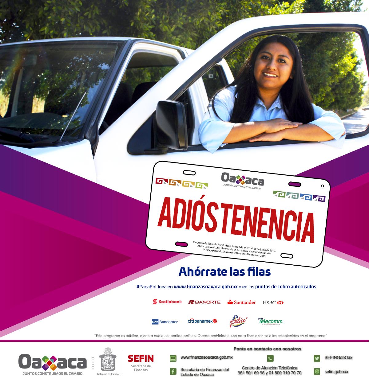 El programa “Adiós Tenencia” está enfocado a contribuir en la economía de las familias oaxaqueñas con el ahorro del pago correspondiente, además que incentiva a los contribuyentes que han cumplido en tiempo y forma con sus impuestos vehiculares, destacó el titular de la Sefin, Vicente Mendoza Téllez Girón.