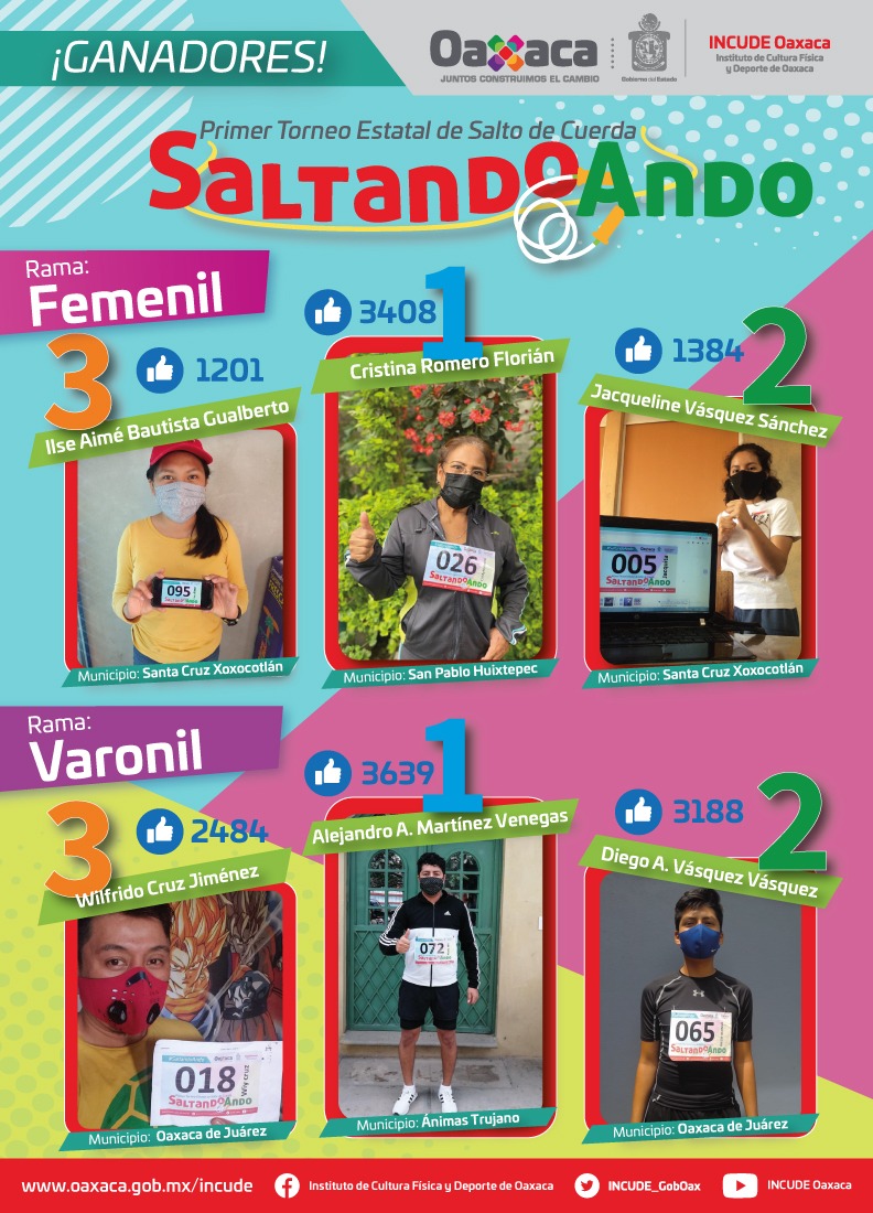 Cabe destacar que los tres ganadores y las tres ganadoras del Primer Torneo Estatal de Salto de Cuerda, pertenecen a Valles Centrales y fueron definidos por el total de “Me gusta”, que recibieron sus videos con los que participaron y se publicaron en la página de Facebook del Incude Oaxaca.