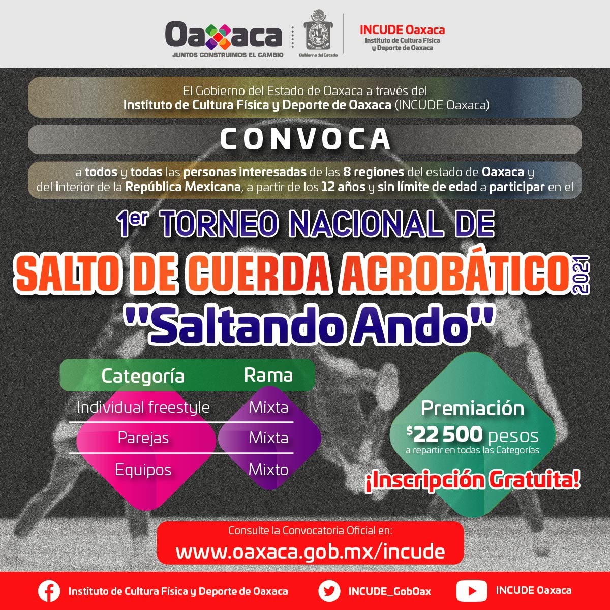 Oaxaca de Juárez, Oax. 26 de septiembre de 2021.- El Instituto de Cultura Física y Deporte de Oaxaca (Incude Oaxaca), invita a todas las personas a partir de los 12 años de edad, de las ocho regiones del estado y del territorio nacional, a participar en el Primer Torneo Nacional de Salto de Cuerda Acrobático 2021, “Saltando Ando”.