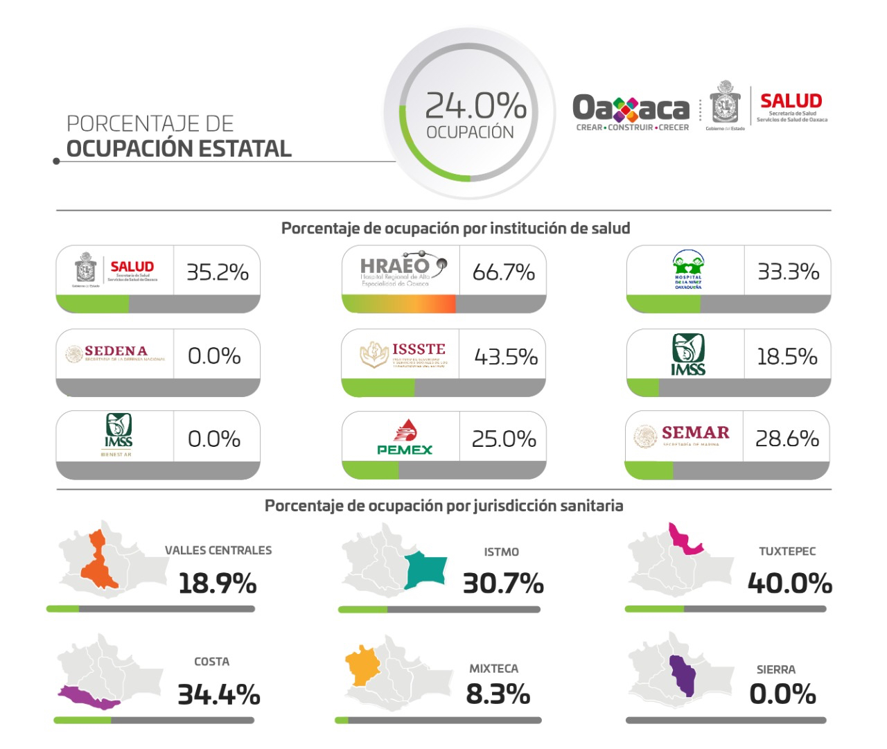 Por Jurisdicción Sanitaria, Valles centrales registra un 18.9%, Istmo 30.7%, Tuxtepec 40%, Costa 34.4%, Mixteca 8.3%, Sierra 0 %, con un global del 24% de ocupación hospitalaria.