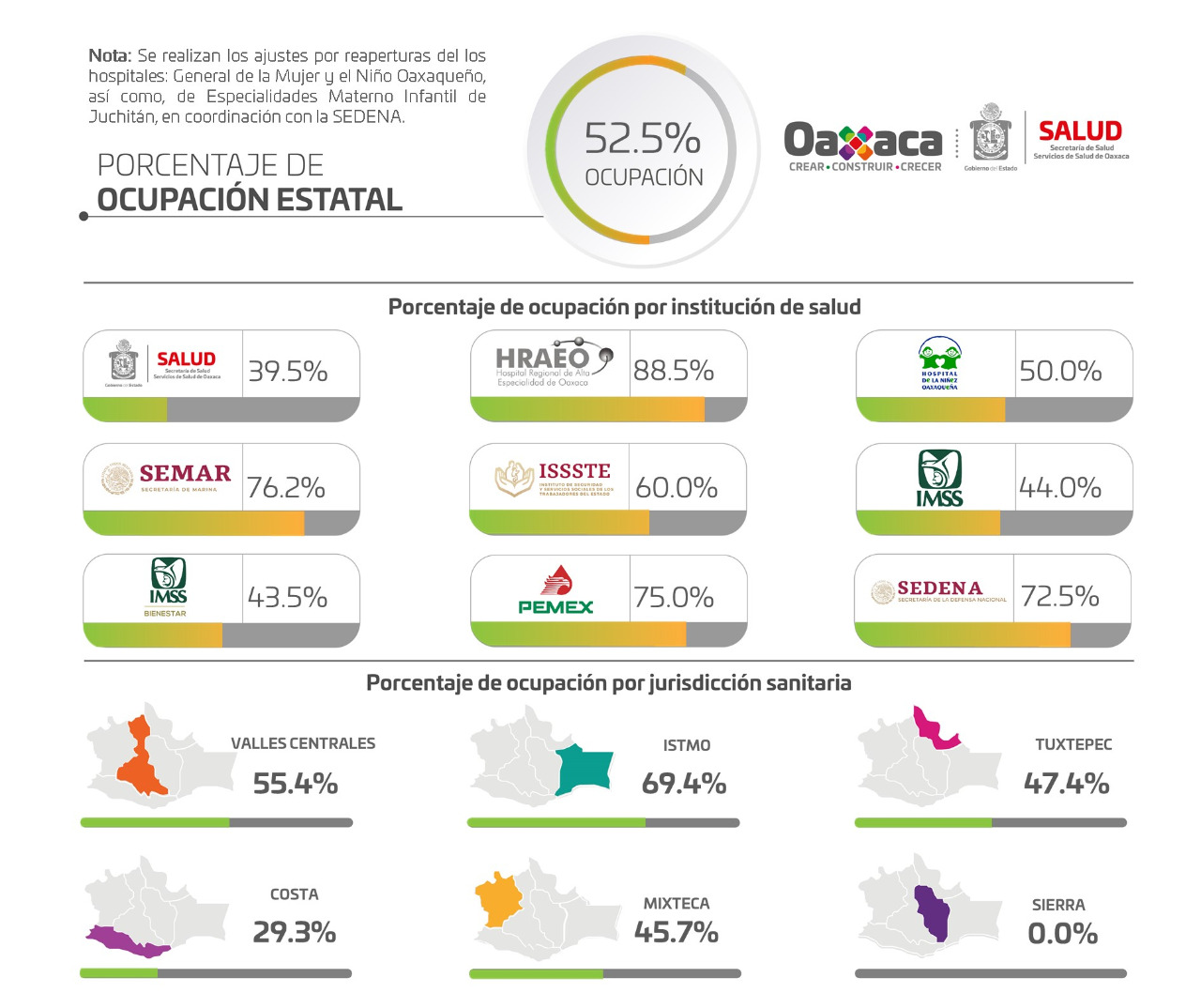 Por Jurisdicción Sanitaria, Valles Centrales notificó 55.4% de ocupación médica, Istmo 69.4%, Tuxtepec 47.4%, Mixteca 45.7%, Costa 29.3%, y Sierra 0%.
